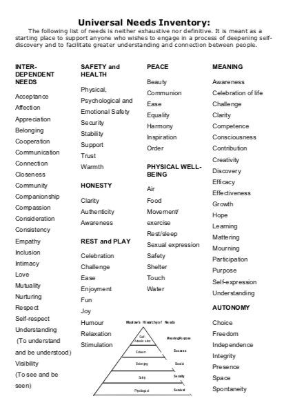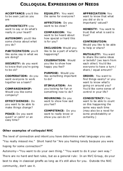 Now take a moment and ask yourself in both situations what were the needs trying to get met? Scan the list above to find one that resonates for you per situation. Now in that instance, now that I know the need, how could I have begun to give myself that need? How could I have communicated it to another? How could I have taken care of that need?